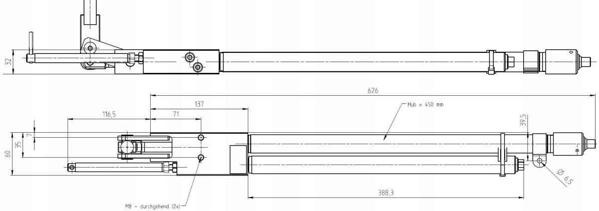 этот насосный блок состоит из гидравлического цилиндра одностороннего действия и гидравлического насоса. Цилиндр имеет диаметр штока поршня 16 мм и ход 450 мм. Насос создает давление до 280 бар. С помощью этого устройства можно поднять 575 кг. Опускание осуществляется через операцию разгрузки.