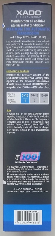 двухкомпонентный продукт, обеспечивающий взаимодействие кондиционера металлов и ревитализатора 1 стадии 3-го поколения. Предназначен для восстановления и защиты от износа и nbsp; автоматических коробок передач всех разновидностей и вариантов, включая Tiptronic,Steptronic, CVT при нормальной эксплуатации. Revitalizant, функционируя в верхних слоях, заставляет процесс их восстановления в очень прочные и износостойкие металлокерамические слои и тем сильнее, чем больше энергии появляется в местах трения. Обеспечивает активную защиту от перегрузки и перегрева.
