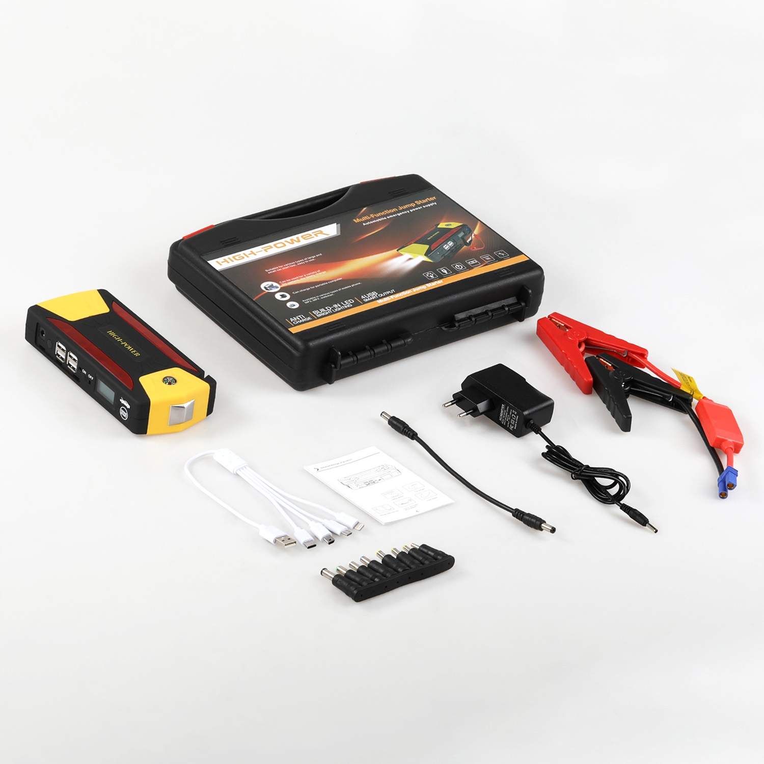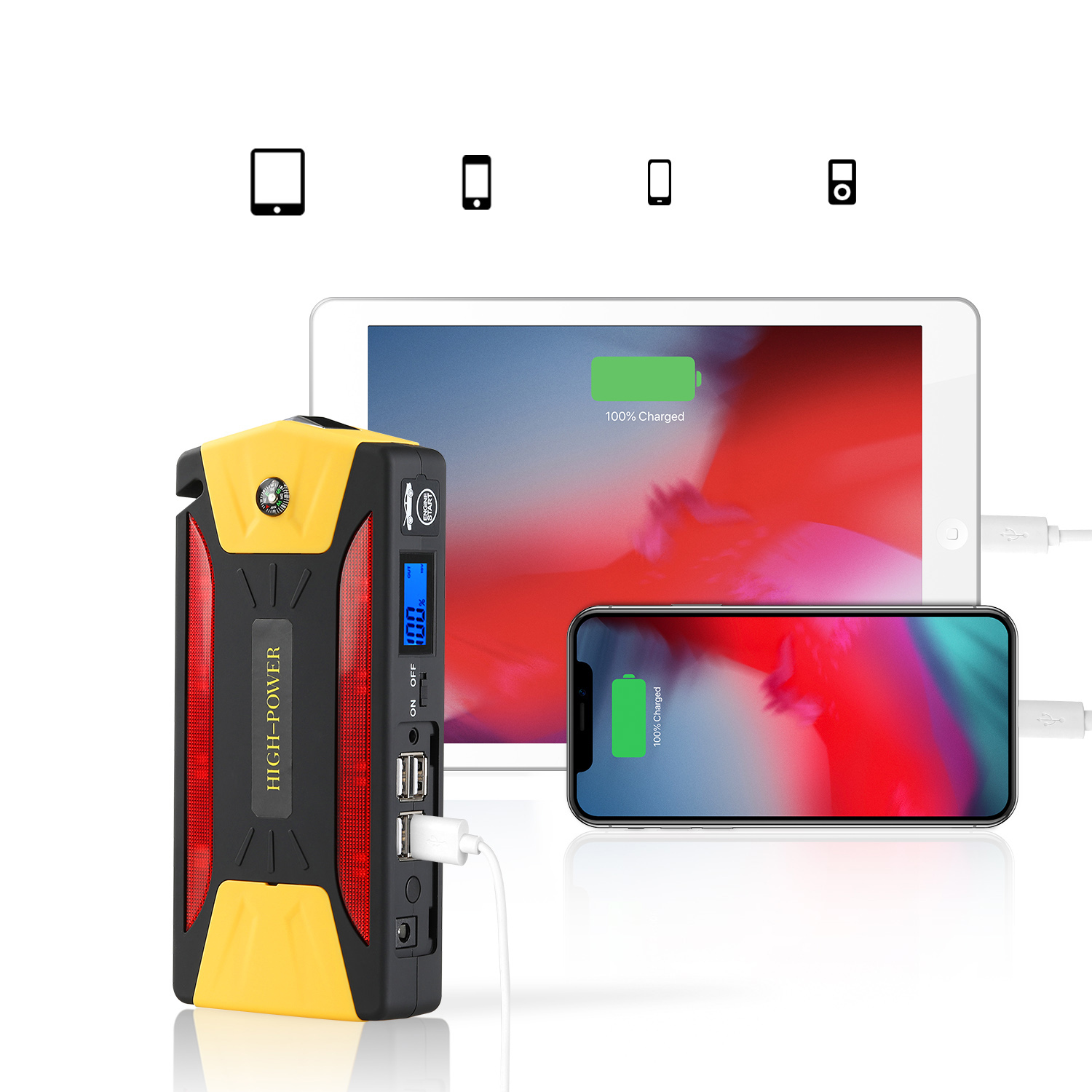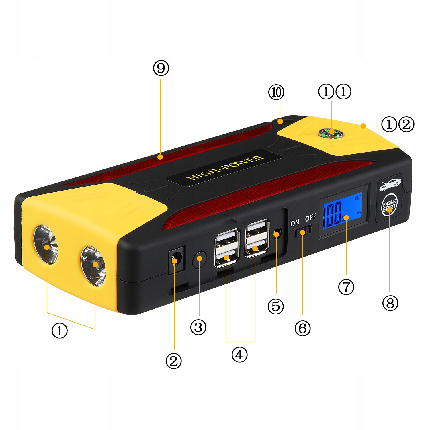 высокоэффективная батарея 10000 мАч (пик 600 а) совместима с транспортным средством 12 В (бензиновый двигатель до 6 л / дизельный двигатель 5 л), с 4 USB-портами для зарядки для обеспечения длительного резервного питания мобильного телефона и планшета.п> рабочая температура: