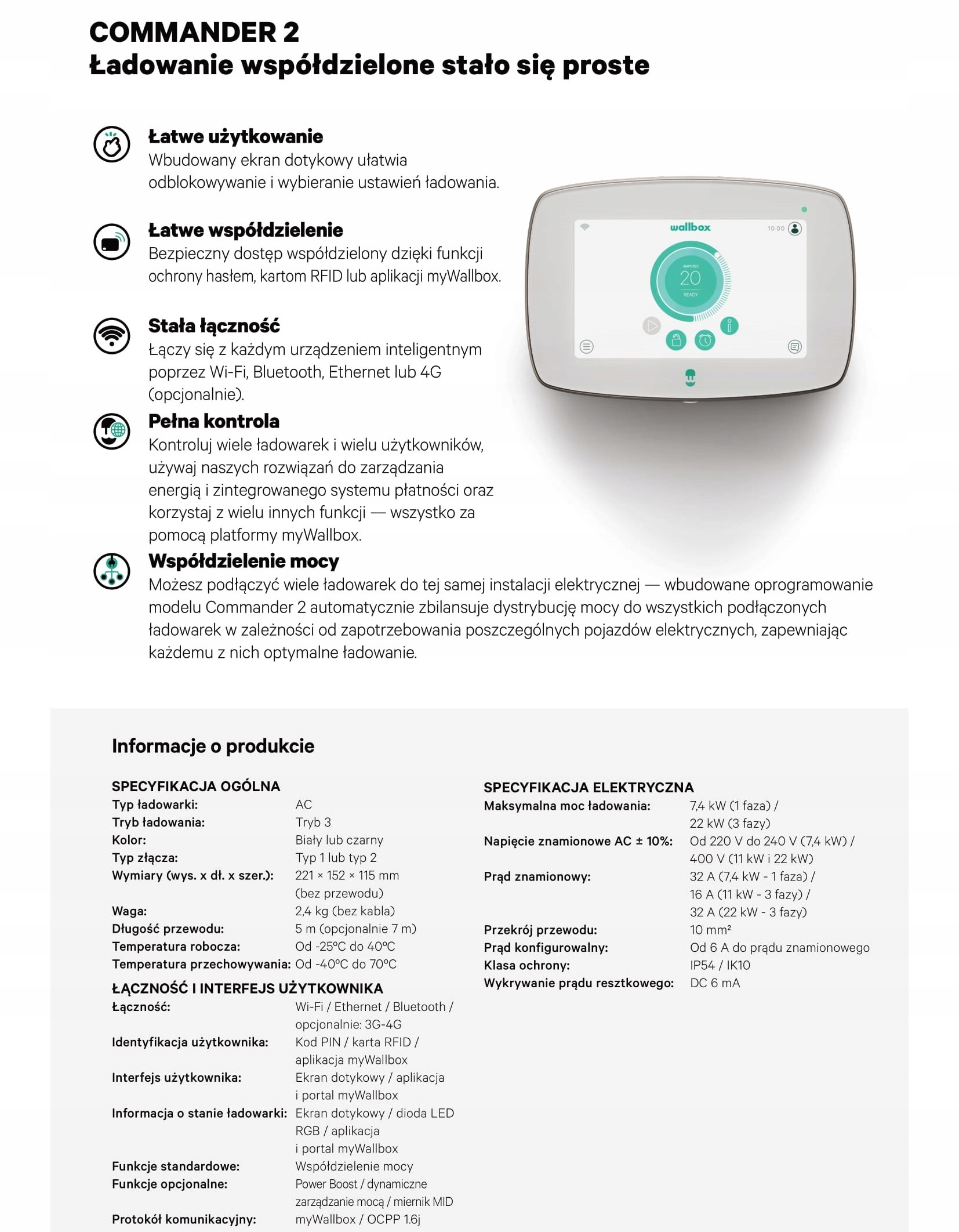 Зарядная станция Wallbox Commander 2 22kw 5M 4G Cz